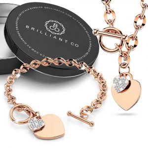 Boxed Diamond cut Belcher Chain Necklace and Bracelet with Dual Heart Charms in Rose Gold