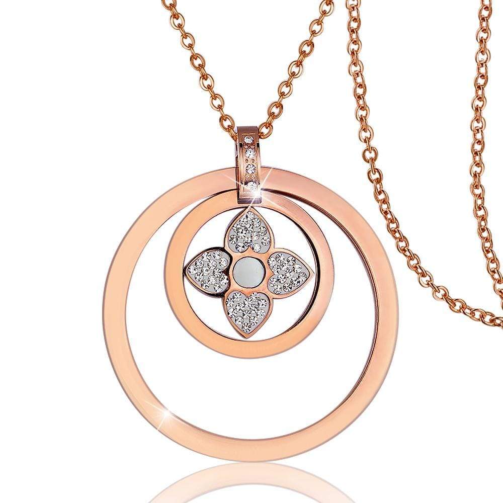 Graceful and on-trend, this 18K Rose Gold layered stainless steel necklace features a chic round pendant accented with lovely flower cut-out studded with shimmering crystals. You had just found the perfect way to express yourself with this one of a kind jewellery that reflects your style.