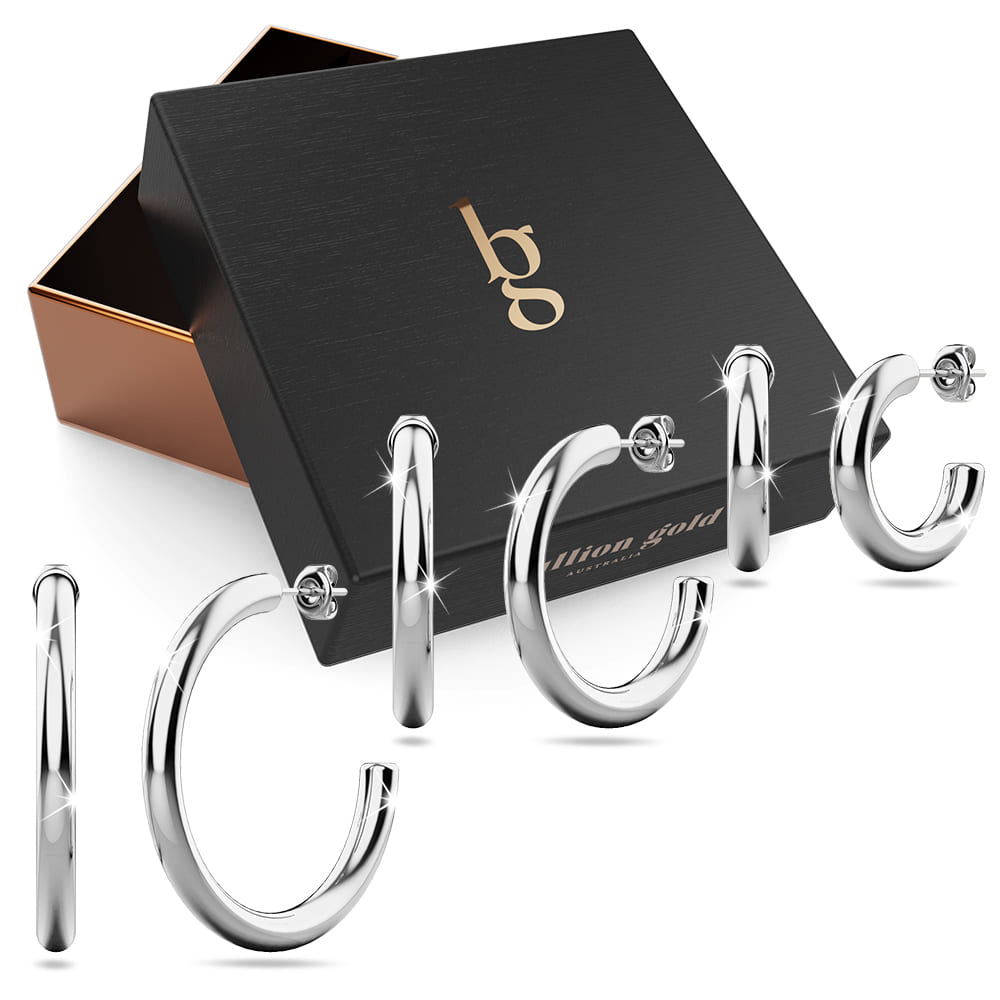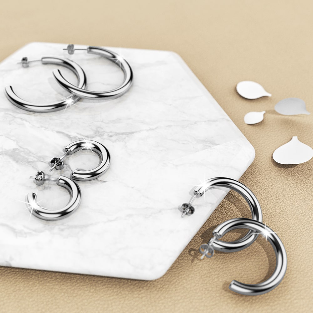 Crafted with Titanium Steel, this stunning jewellery set comes with three pairs of hoop earrings in 18ct White Gold with the same design but different diameter measurement that reveal your sophisticated style. Beautifully packaged in a gift box.