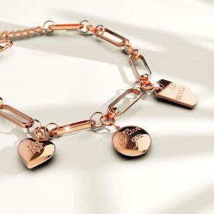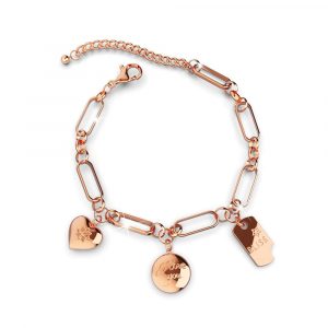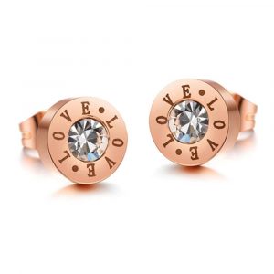 The infinite faithful love is always by your side with a pair of bracelet engraved with Bliss and I love you on the charm and simple stud earrings with engraved word LOVE accented with a round cubic zirconia at the center in rose gold. Suitable for gift gifting for your loved ones.
