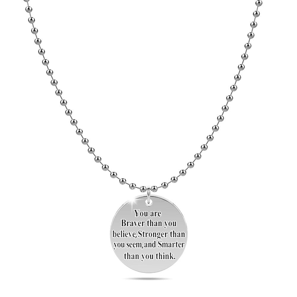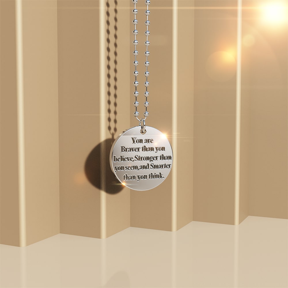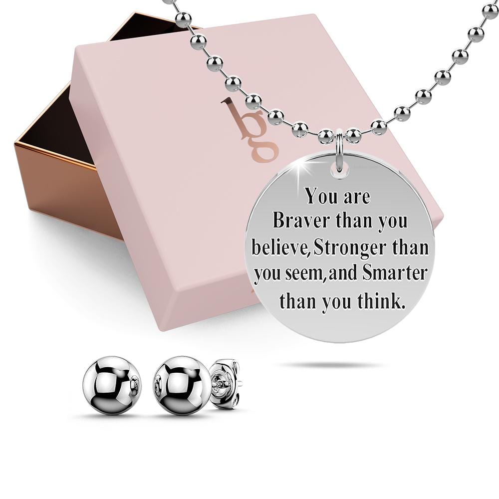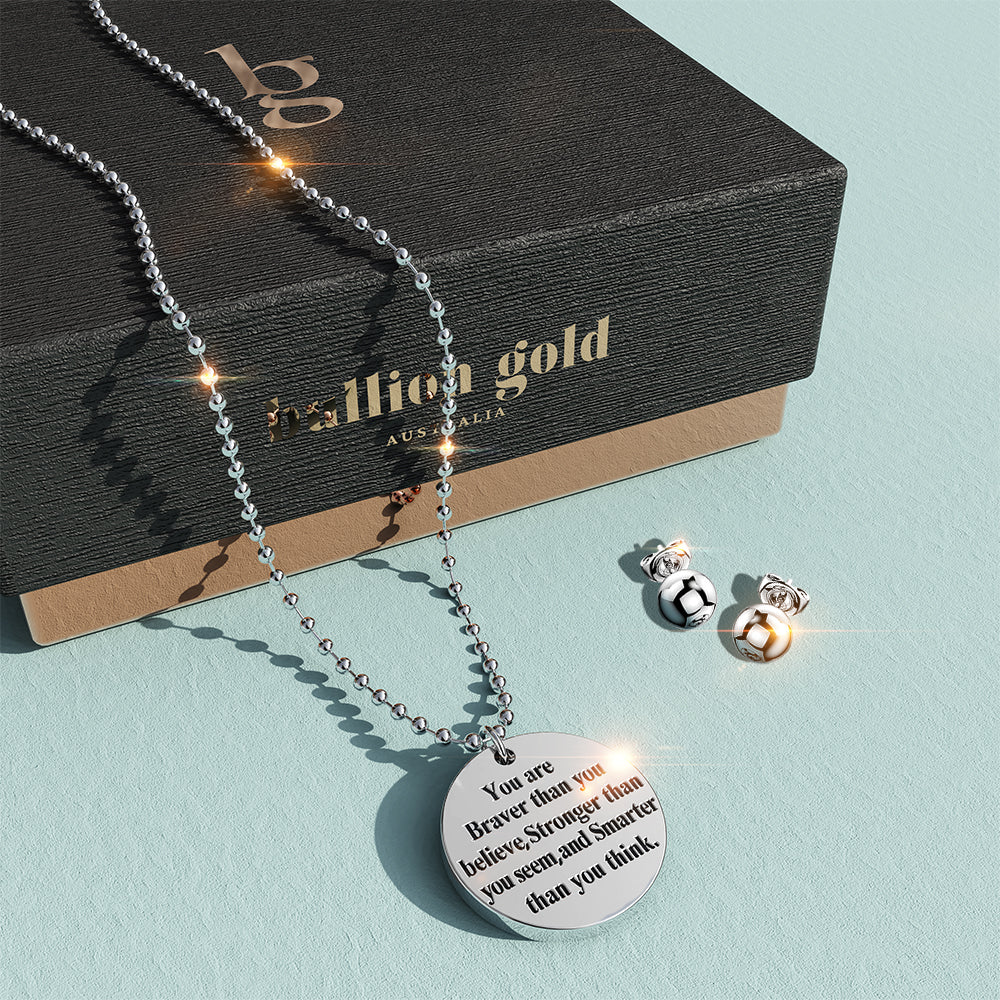 If you are looking for the perfect gift for your loved ones, look no further. This pendant necklace is the gift of passion, strength, and courage. It is made of titanium steel layered with 18ct white gold engraved with words of wisdom. Comes complete with a pair of matching earrings and beautifully packaged in a gift box.