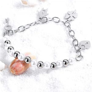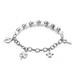 The bracelet features imitation pearls and 4 iconic hanging charms paired with complimenting white pearl stud earrings. They are white layered over stainless steel & alloy to ensure long lasting wear.