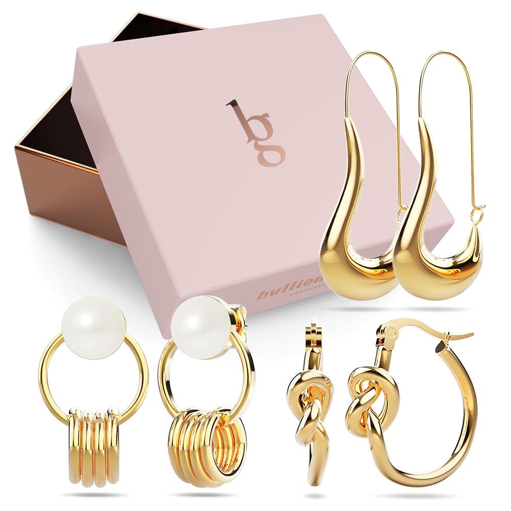 Add a chunk of fun and glamour to your outfit with this exclusive Boxed Gold Titanium Hoop Earrings Gift Set. Featuring The Dakota Chunky Gold Titanium Hoop Earrings, Golden Knot Hoop Earrings Extra Large and Helena Pearl & Charm Ring Gold Titanium Drop Earrings. Designed in 18ct Gold Layered over hypoallergenic Titanium Steel, these intricate-looking hoops will ensure you a look so edgy that you wouldn’t want to take them off! Beautifully packaged in a gift box.