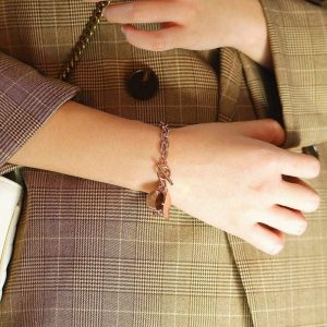 A simple look but means to make it stylish. Set of funky hat charm bracelet in rose gold paired with sophisticated hoops earrings makes a great wear for casual or formal ensemble.