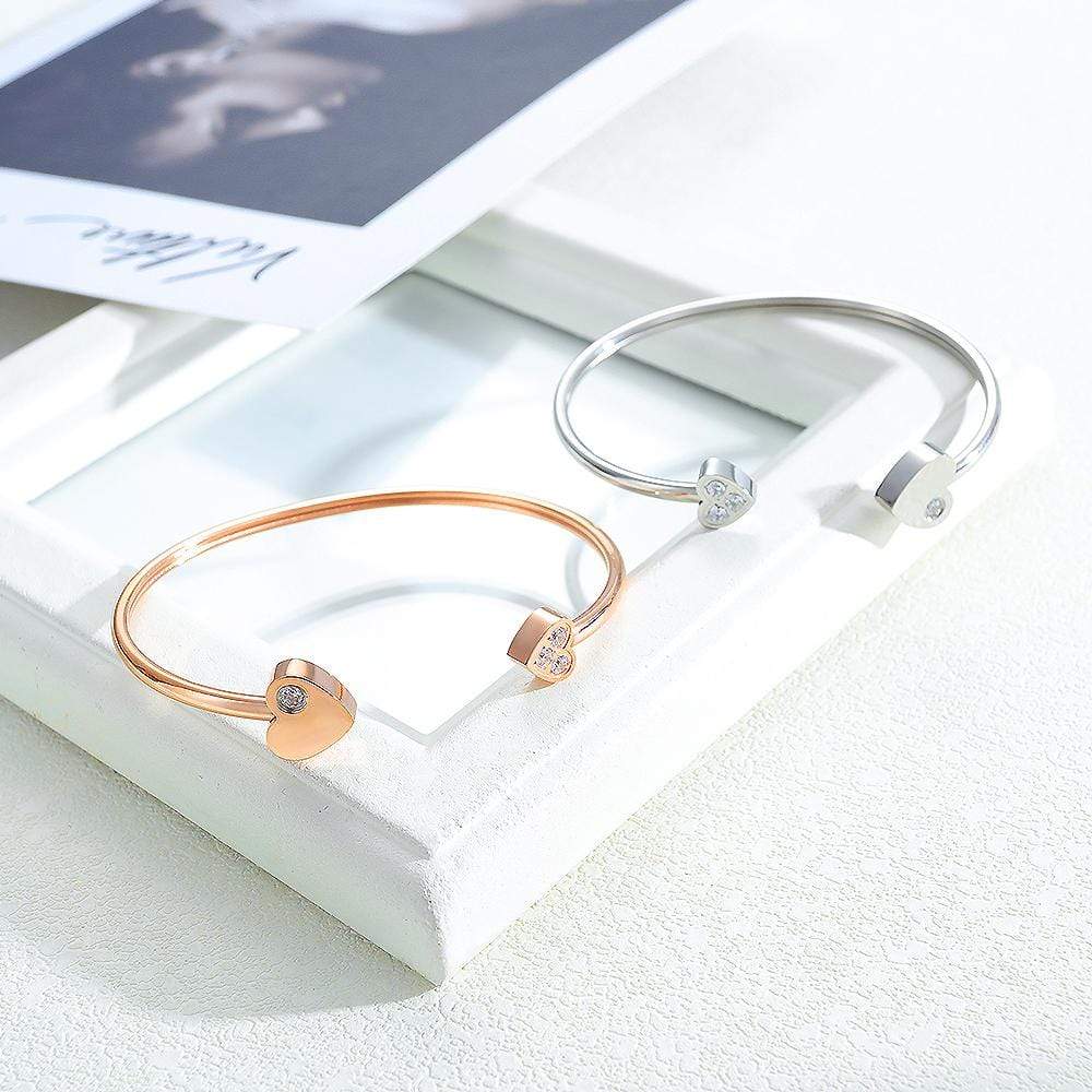 Brilliant alone or stacked with other bracelets, this Open Cuff Bangle is complemented with heart shaped motifs featuring Zirconia crystals on both ends paired with hoop earrings, is a fabulous way to express yourself in a subtle yet fashionable way.