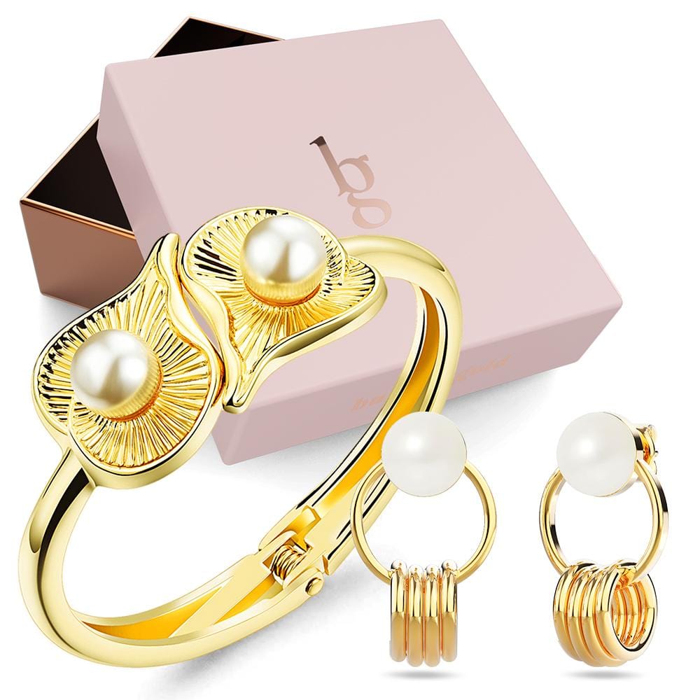 This beautiful bangle is crafted of 18ct Gold layered alloy.Simply gorgeous!. Comes complete with a pair of earrings and beautifully packaged in a gift box.