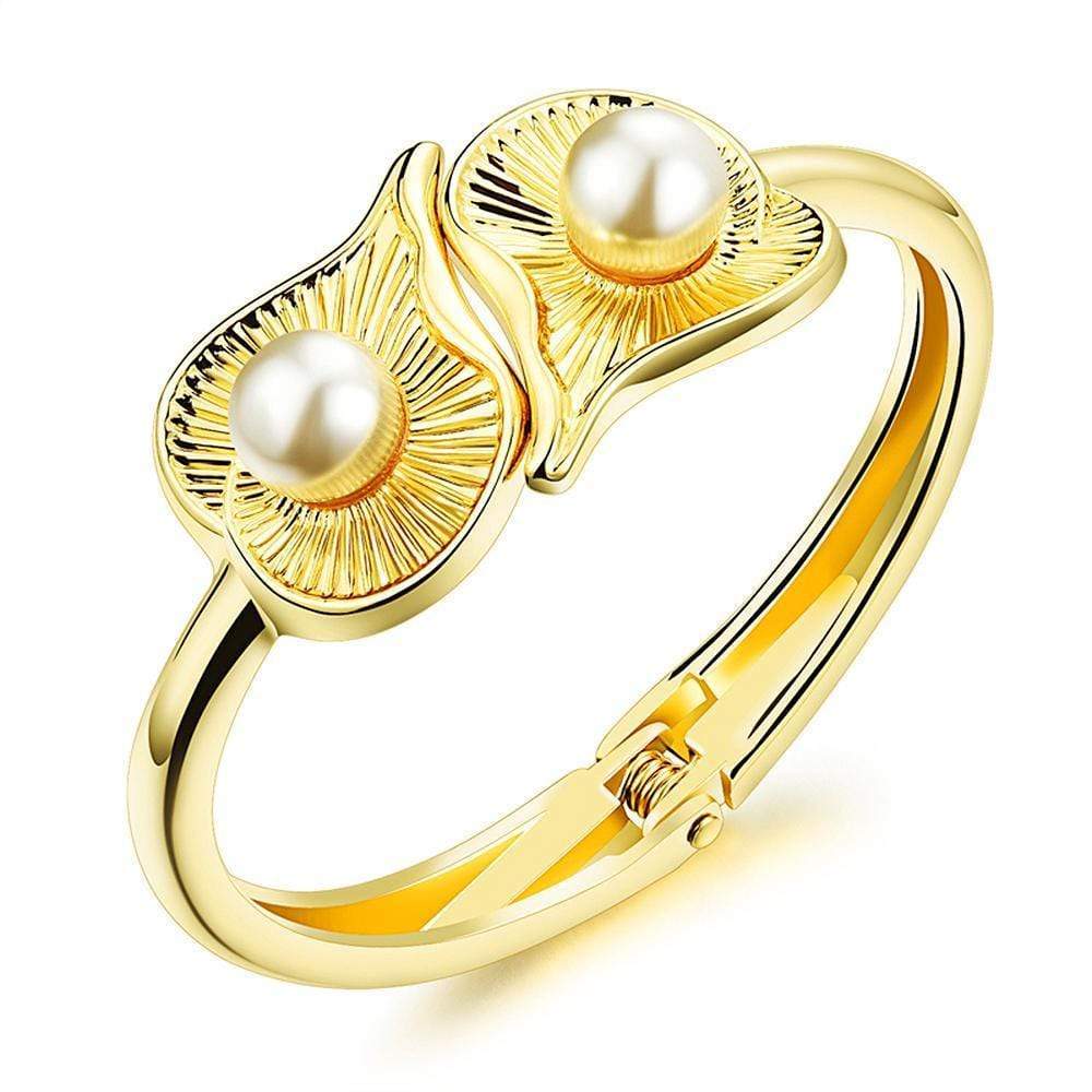 Bring extra glamour and elegance to your look with this hinged bangle designed with two leaves meeting end to end, accented with two shiny round pearls that add grace and glamour to this exquisite piece