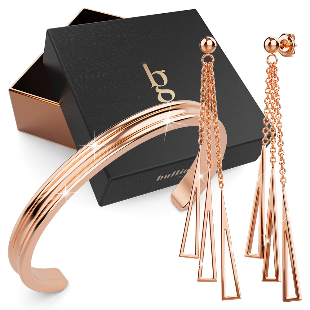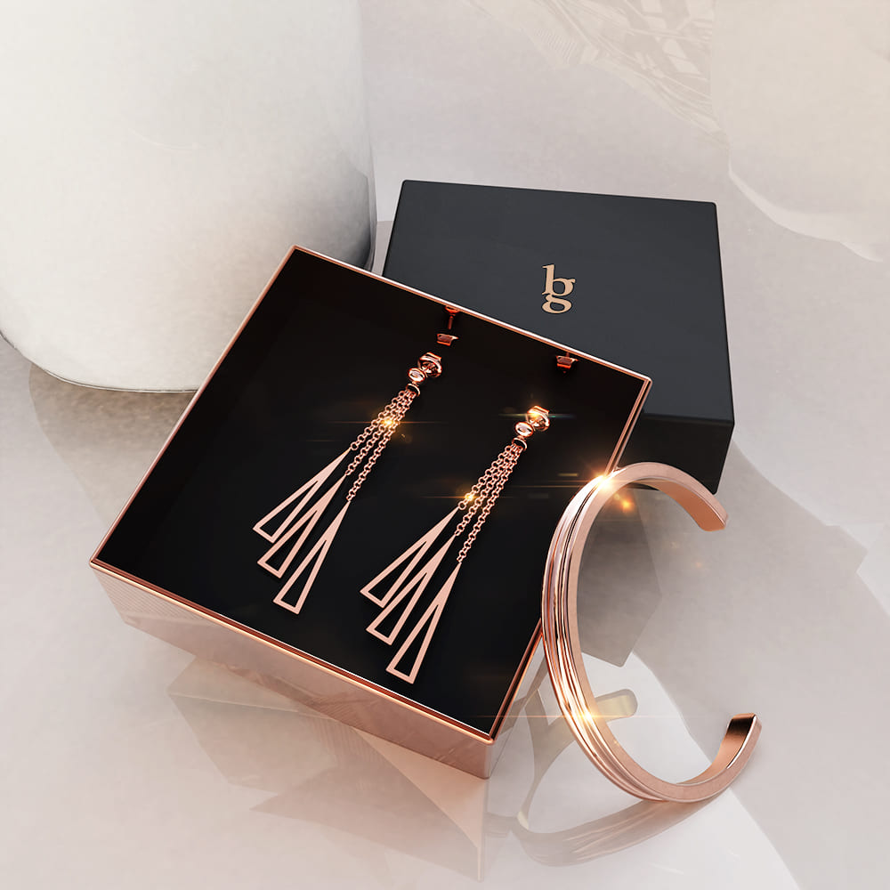 The asymmetrical design on this earring set complements the bangle perfectly, creating a bold statement that looks great on any face shape. It’s the perfect addition to any wardrobe and will take you from day to night in no time.