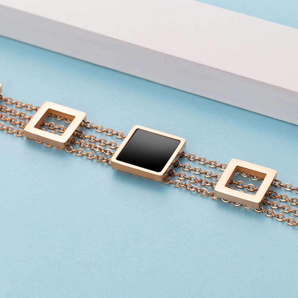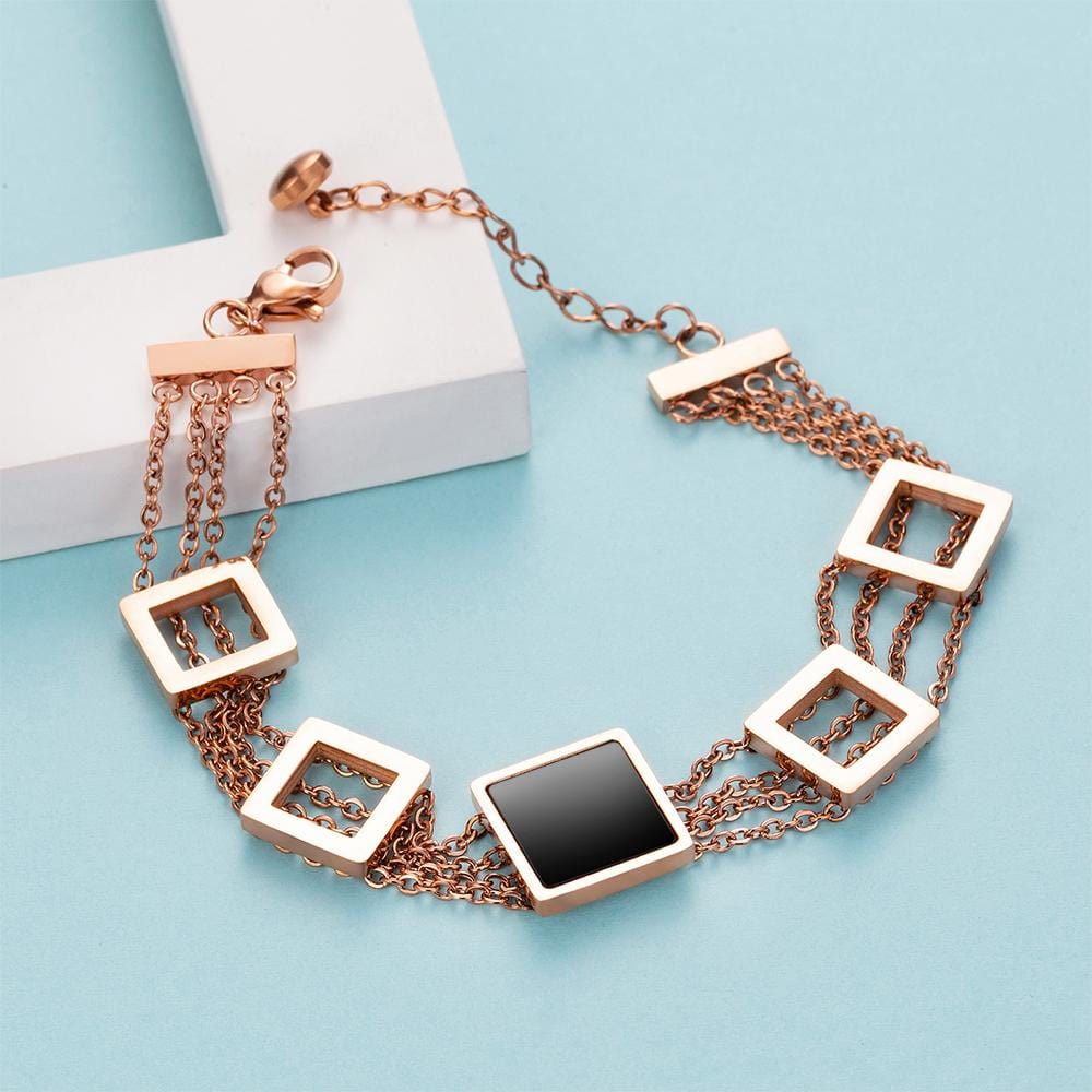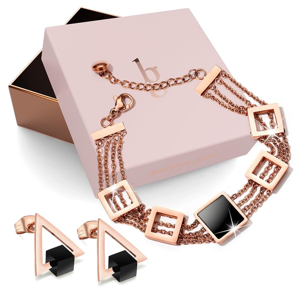 With a bold, geometric design and a beautiful rose gold finish, this layered chain bracelet is as fashionable as it is durable. It’s crafted from titanium steel and features a clasp closure to ensure it stays secure on your wrist. Comes complete with a pair of earrings and beautifully packaged in a gift box.