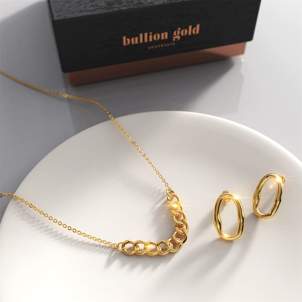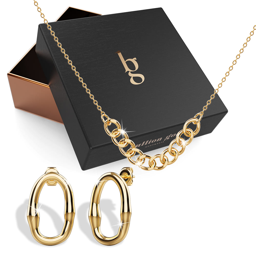 Assuring you a statement look with this amazing set of Chain Necklace and Oval Stud made fine with 18ct gold layered titanium steel. A definite essential to your wardrobe.