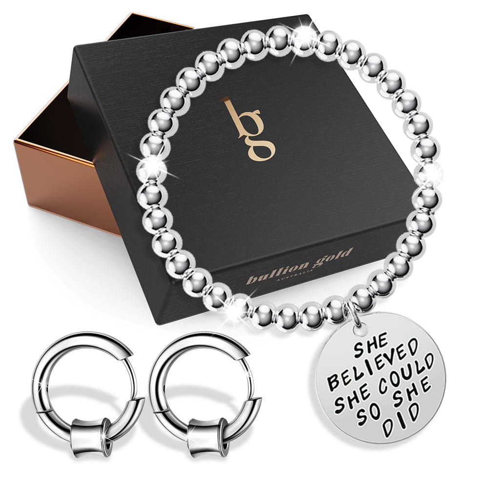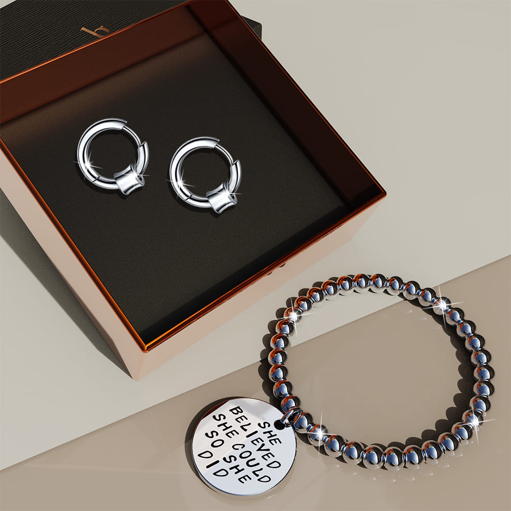 Are you a modern woman wanting to add a touch of luxury to your outfits? This 18ct white gold layered bracelet and earrings set will do just about that. Wear on and conquer that stunning look!