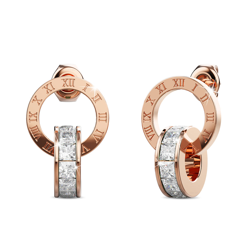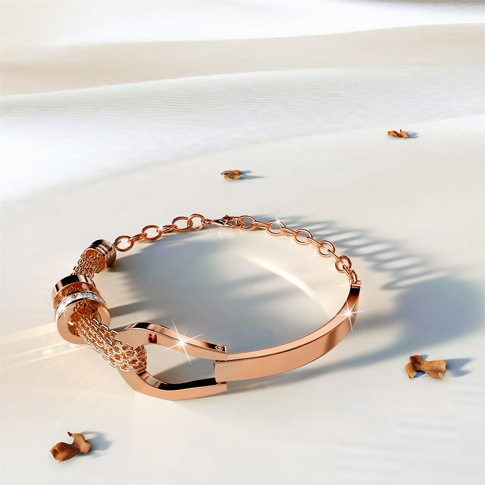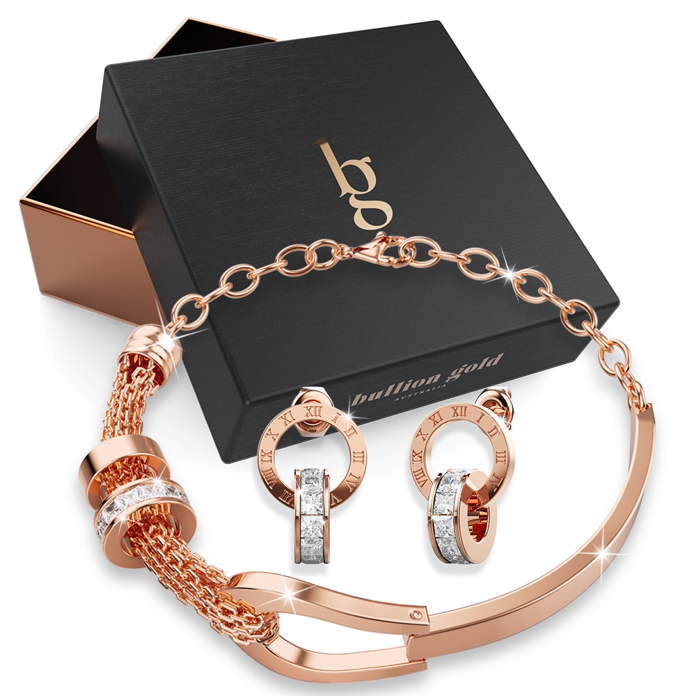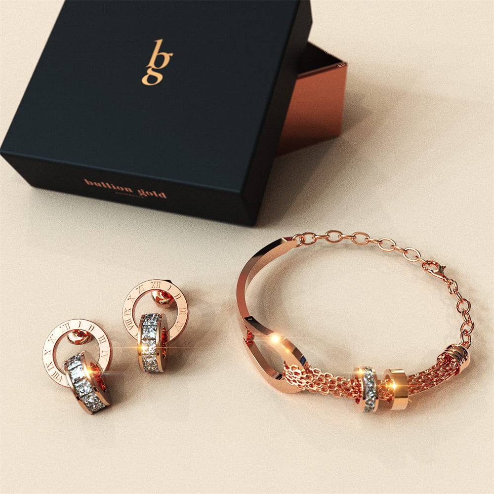 This timelessly elegant set is the perfect way to brighten up any look, from casual to evening look! Both bracelet and earrings were designed with rose gold-tone plating and embellished with a classic row of channel-set stones eternity-ring pendant for an elegant combination. The bracelet includes hoop pendants and a touch of layered chains with a simple yet breathtaking knot design.