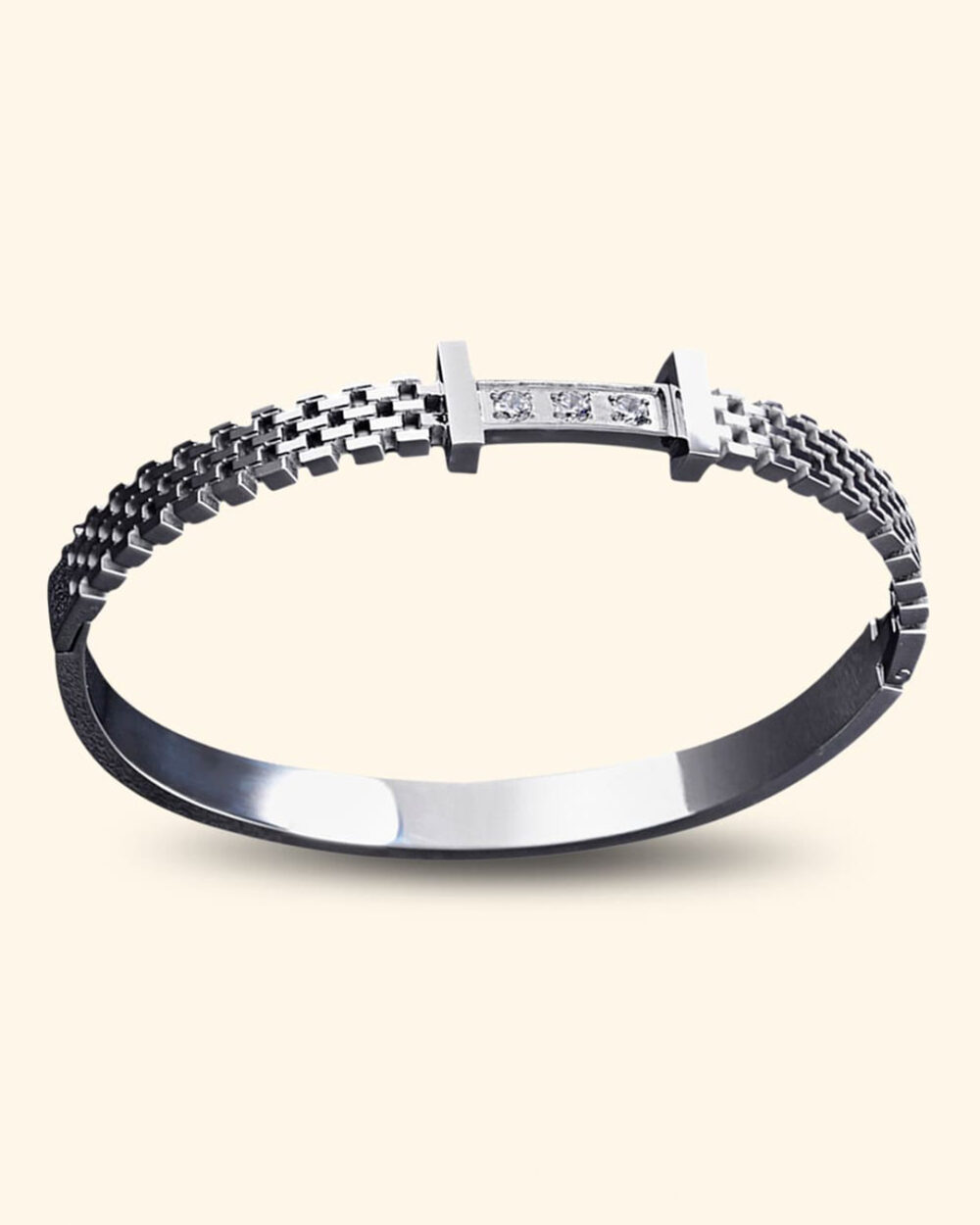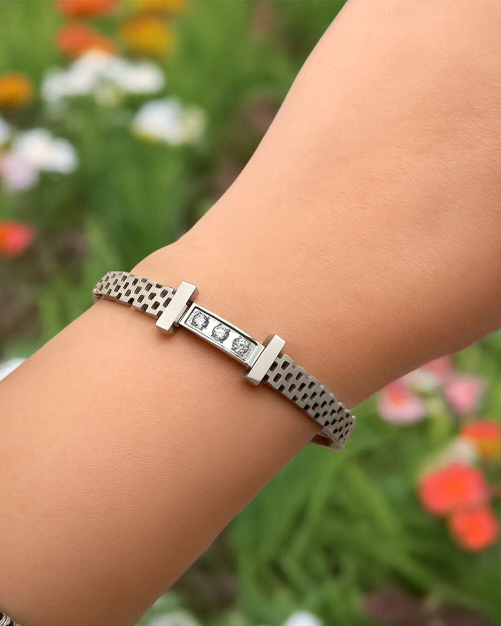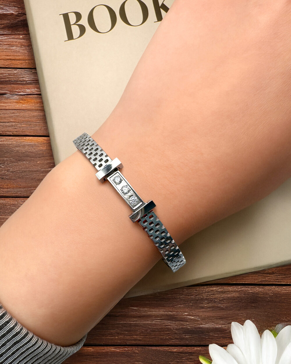 Adorn your wrist with this stylish bangle featuring 3 small round-cut zirconias as center attraction. Crafted with 18K White Gold finish, this sleek bangle displays a high polish finish that gives you a timeless appeal.
