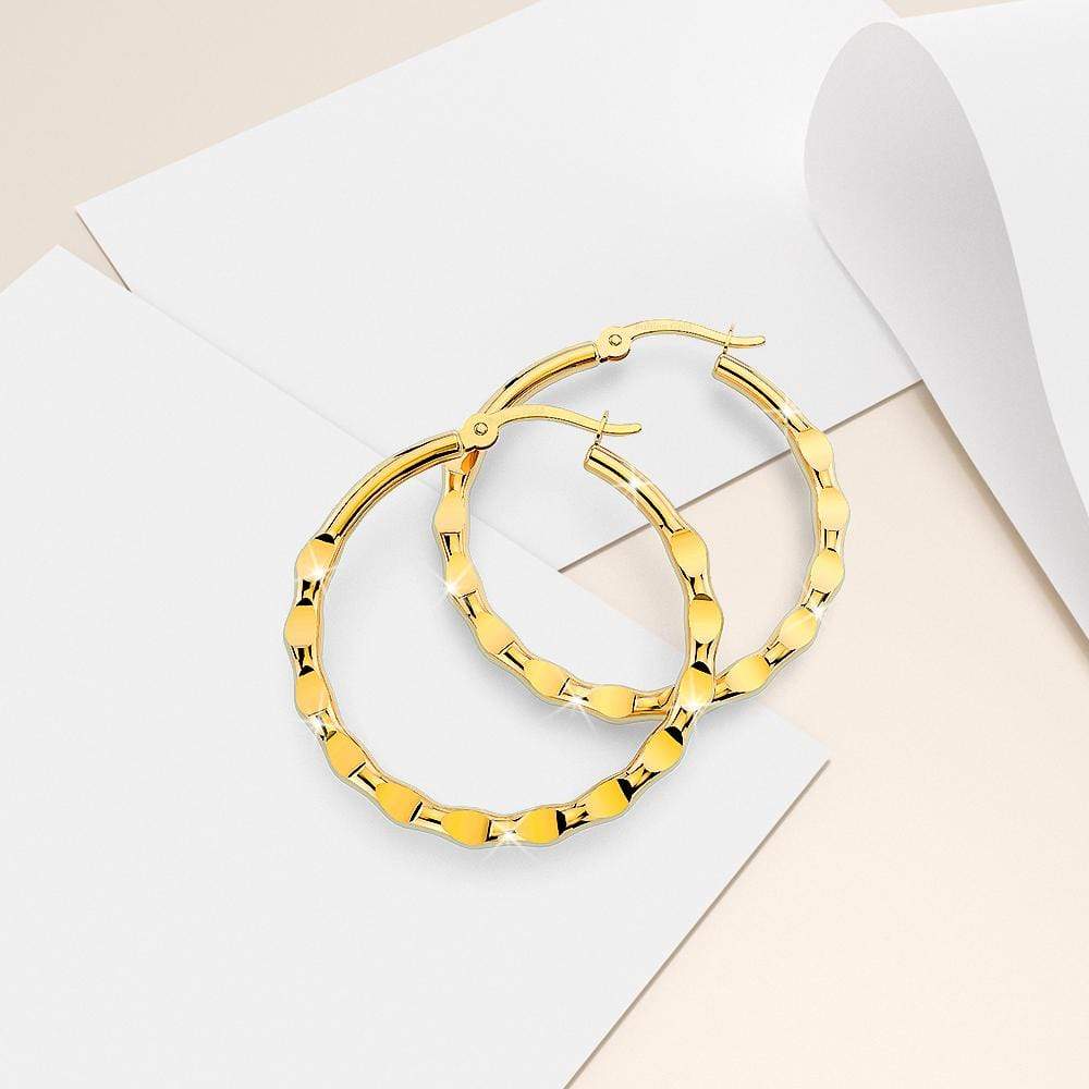 Flaunt this sleek hammered texture hoop crafted of 18ct gold layered stainless steel. Each earring is secured with hinged post clasps. A classy piece that will bring out the sophisticated side of you.