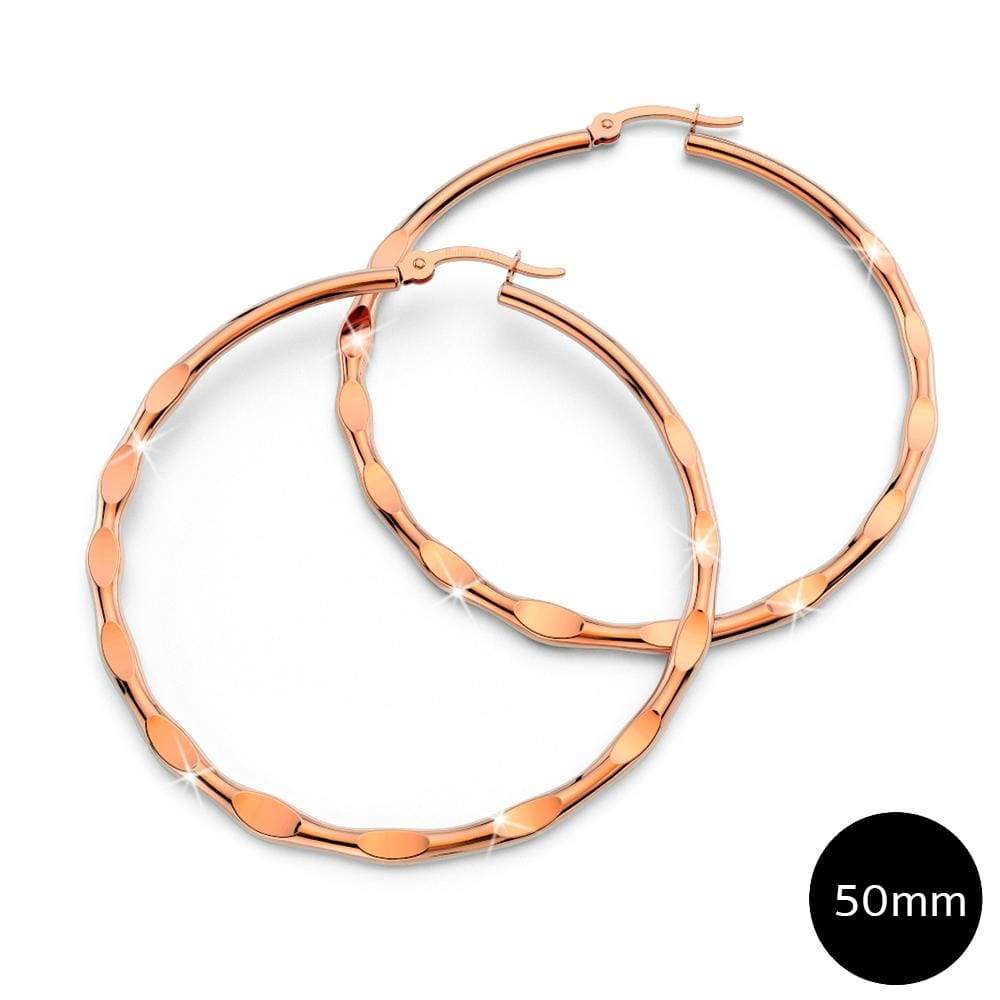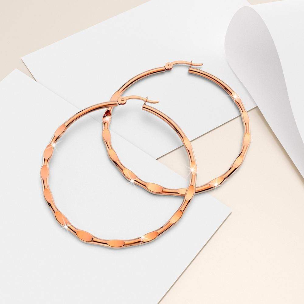 Flaunt this sleek hammered texture hoop crafted of 18ct rose gold layered stainless steel. Each earring is secured with hinged post clasps. A classy piece that will bring out the sophisticated side of you.