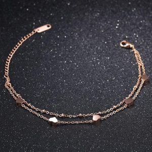 Convey a sweet and graceful aura when you wear this lovely double strand bracelet featuring cute heart shape charms in highly polished 18K Rose Gold layered stainless steel. This bracelet stays securely fasten with an adjustable lobster claw clasp. A fashion-trendy design thatis sure to be your next go-to accessory.