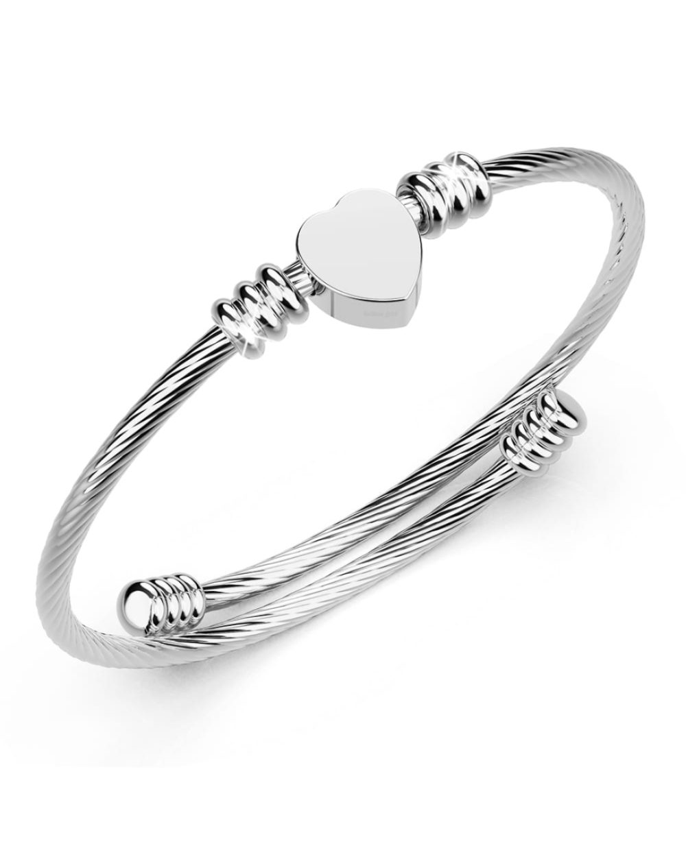 This truly is a statement piece that will go with anything. Wear it with denim or your favourite dress. This bangle features an open heart motif, stretch spiral coil and 18ct White Gold finish bangle. Perfect for the woman who wants to make a statement while maintaining the perfect balance of sophistication and modernity. Pair this bangle with the matching ring (sold separately) for an elevated finish. This stunning piece is crafted from titanium steel, which means that it’s both hypoallergenic and nonreactive to most skin types, making it perfect for sensitive skin types.
