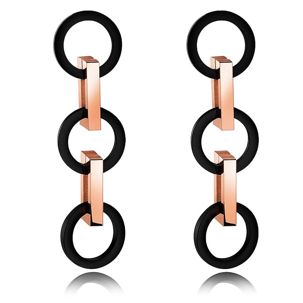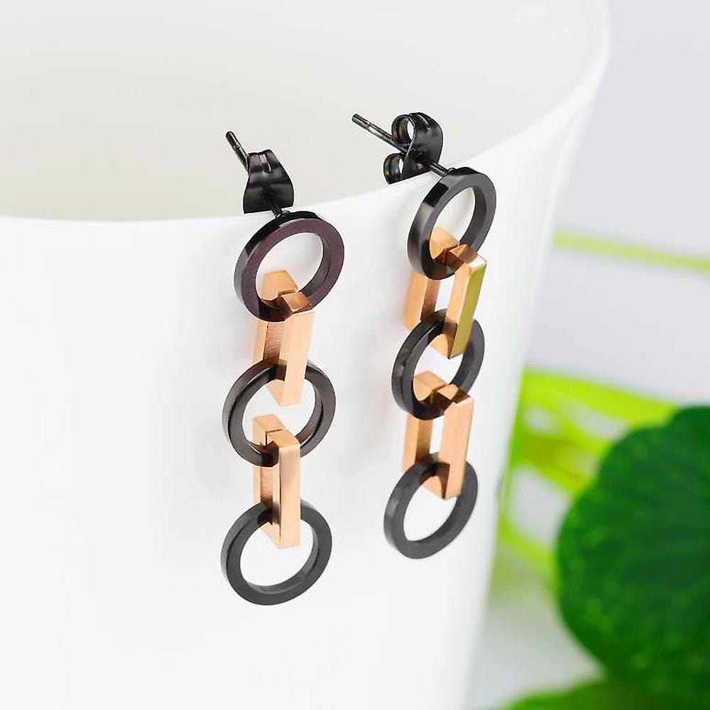 Wear these gorgeous earrings to enhance your casual or formal look. Showcasing an interlocking circle and rectangle cut-outs forming 3-tier design dangle, these lovely earrings are finely crafted from stainless steel layered with 18K Rose Gold. Truly a unique and modern accessory that will complement any wardrobe.
