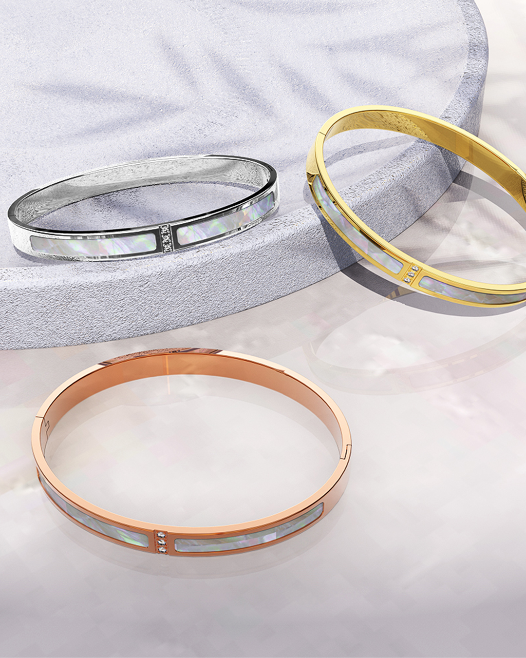 Clean and sophisticated, our Modest Bangle in Gold Layered Stainless Steel is a stunning addition to any outfit. Featuring a secure side hinged locking closure, this 14ct Gold plated bangle is beautifully wrapped around by an elegant Mother of Pearl inlay and is gorgeously embellished with cubic zirconias, giving it that ever-polished look. A minimalist piece that is bold enough to turn heads wherever you go.