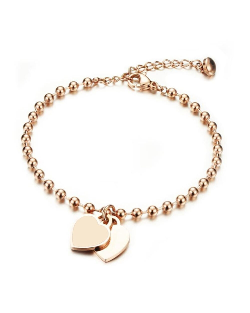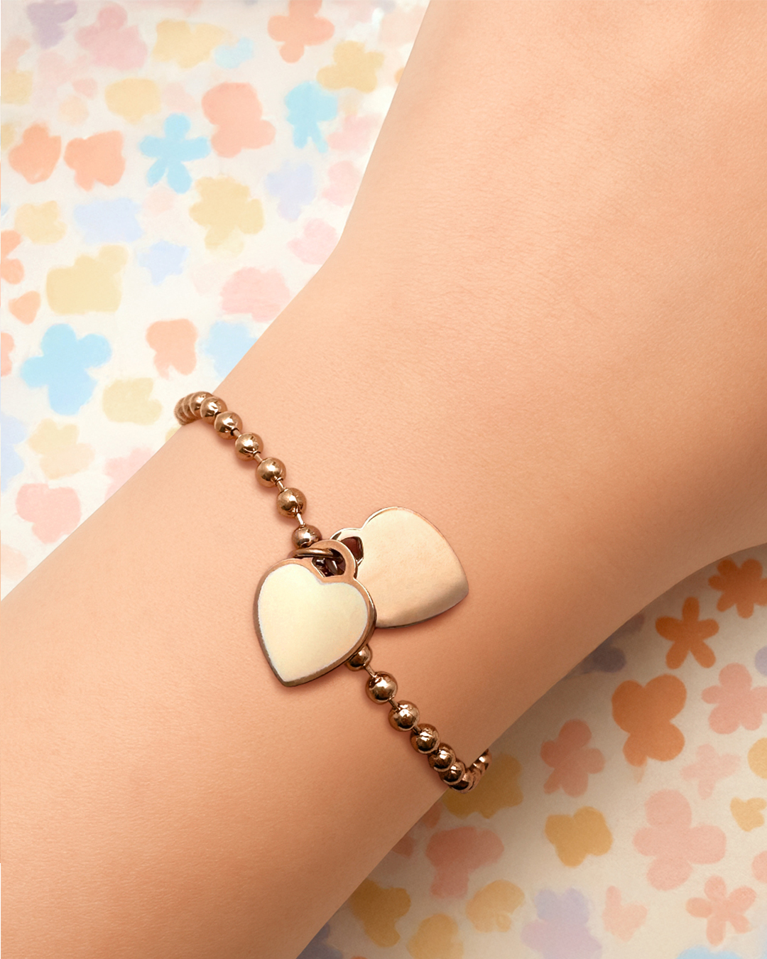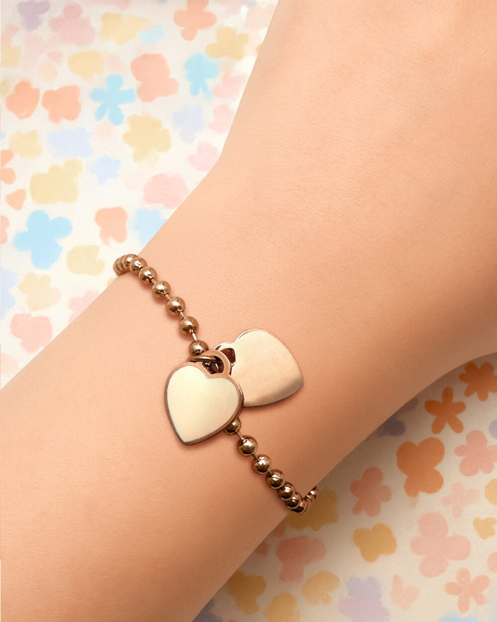 Simple yet sweet, this highly polished bracelet features two heart charms. This bracelet is designed with a classic ball chain for a petite look and it is fastened with an adjustable lobster claw clasp. Crafted from 18K Rose Gold layered stainlees steel, this lovely piece is fit for on-the-go ladies.