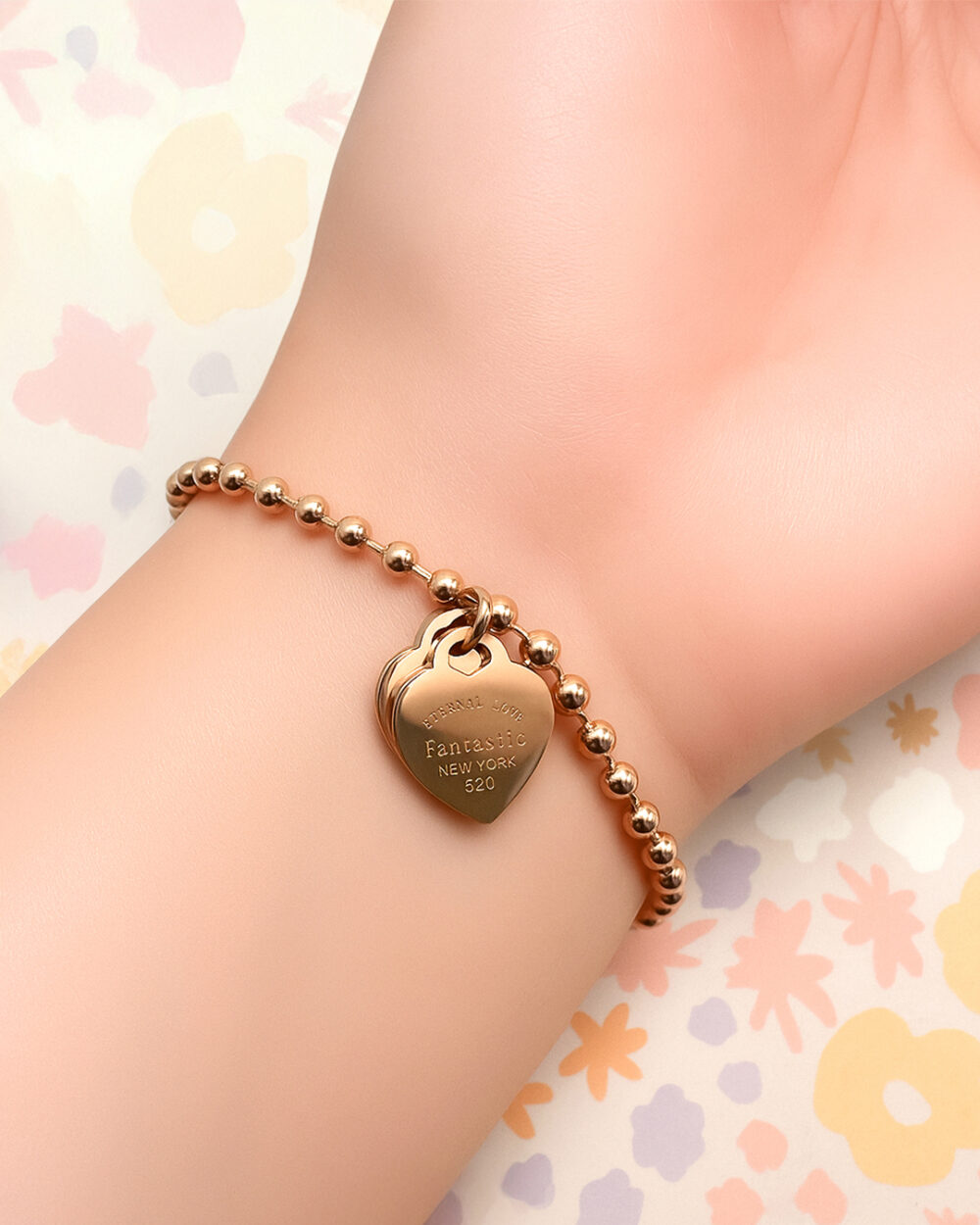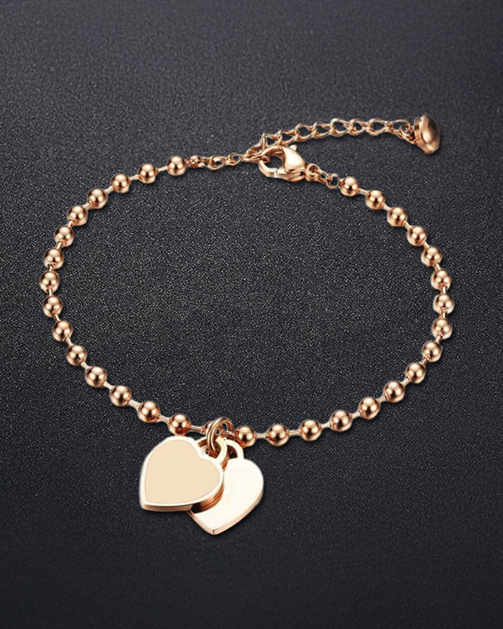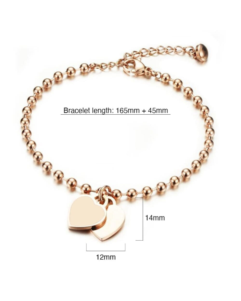 Simple yet sweet, this highly polished bracelet features two heart charms. This bracelet is designed with a classic ball chain for a petite look and it is fastened with an adjustable lobster claw clasp. Crafted from 18K Rose Gold layered stainlees steel, this lovely piece is fit for on-the-go ladies.