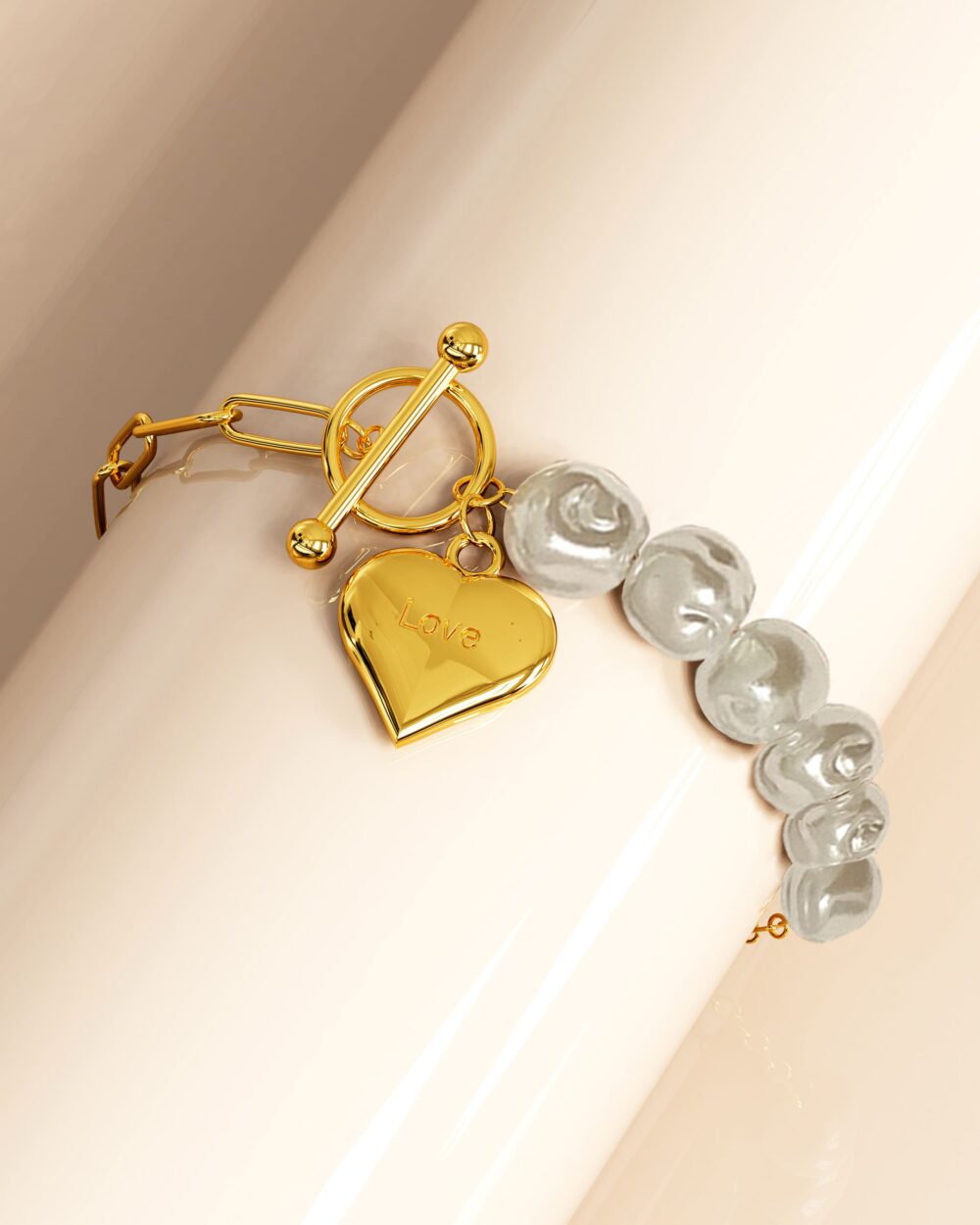 Our Pearl Paper Clip Chain Heart Gold Layered Stainless Steel Bracelet is simply a masterpiece. The 18ct Gold plating adds an extra touch of luxury and the heart-shaped paper clip design at the end of its chain of pearls is perfect for those whom loves to be bold with their jewellery. Whether you’re dressing up or dressing down, this bracelet will always look perfect for any occasion!