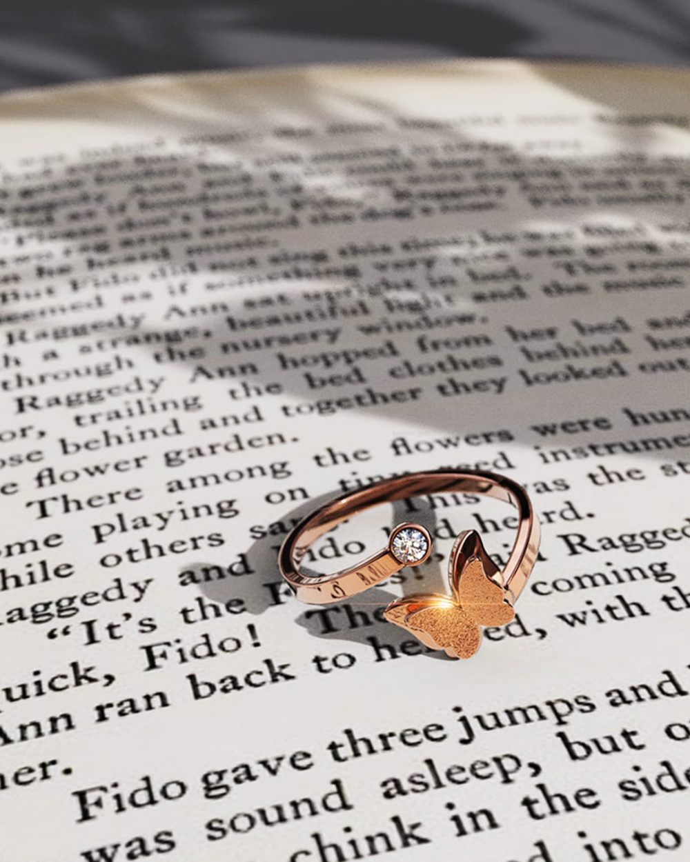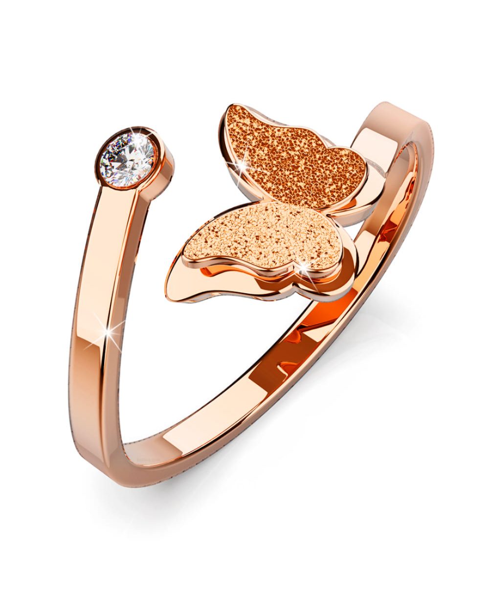 Step out in style with the brand new Mimsy Rose Gold Glitter Textured Butterfly Ring. Featuring your favorite combination of glitter with high polished rose gold plated stainless steel, this beautiful and simple piece of jewelry is a true wardrobe staple that can be worn everyday. Wear it alone or stack them up with your favorite rings for an edgier look.